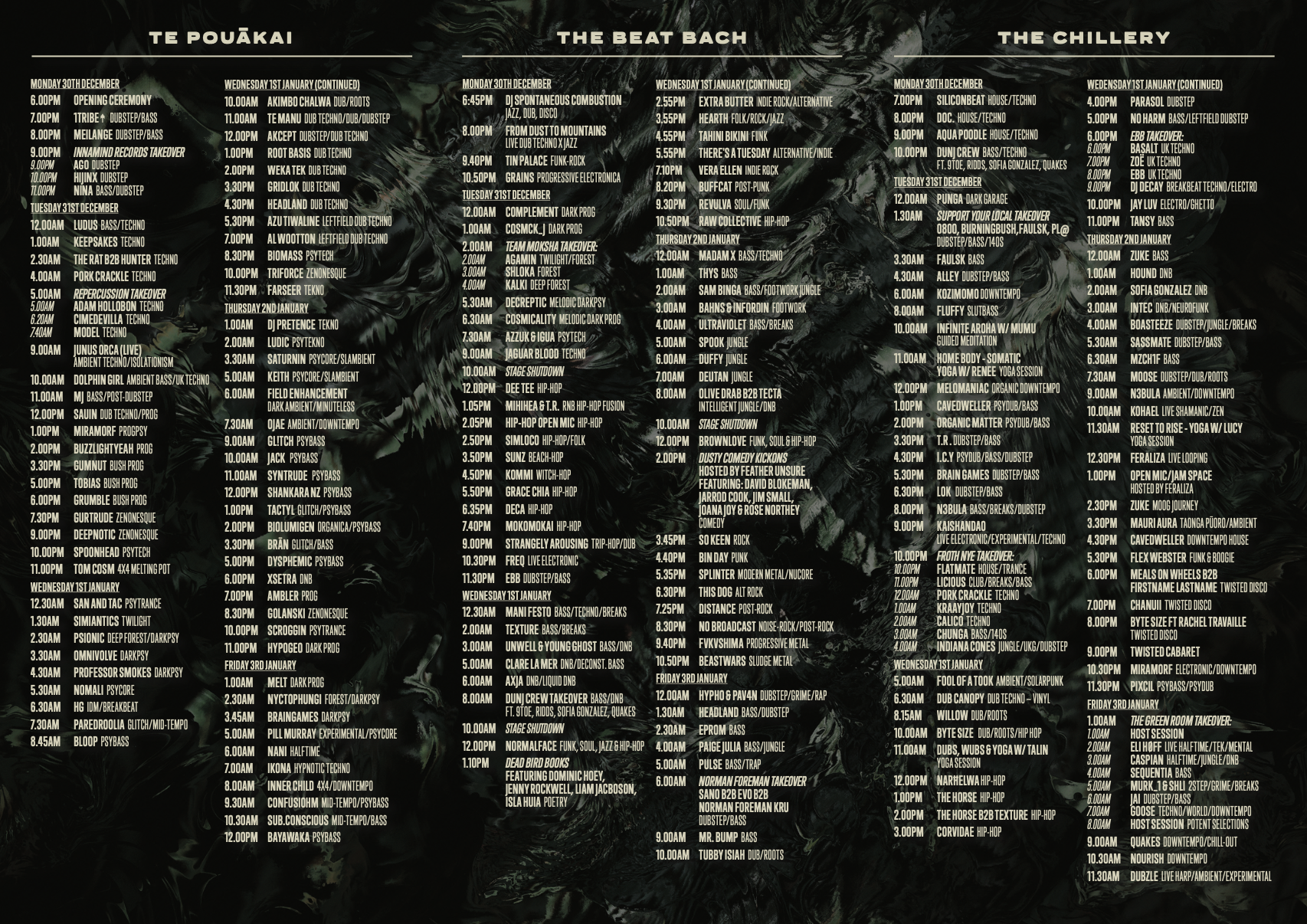 As the name suggests, the beats at Twisted Frequency are not for the faint-hearted. Pumping hard at all hours, Te Pouākai served a meticulous program of psychedelic genres that often sounded like the kick was on the 1-2-3 and 4, played at 300bpm, thrown in a blender then thrown in a larger blender full of decimated blenders. Truly demonic. (Call me basic, but I was clinging to the deep house played during the changeover before Raw Collective on the Beat Bach lol).