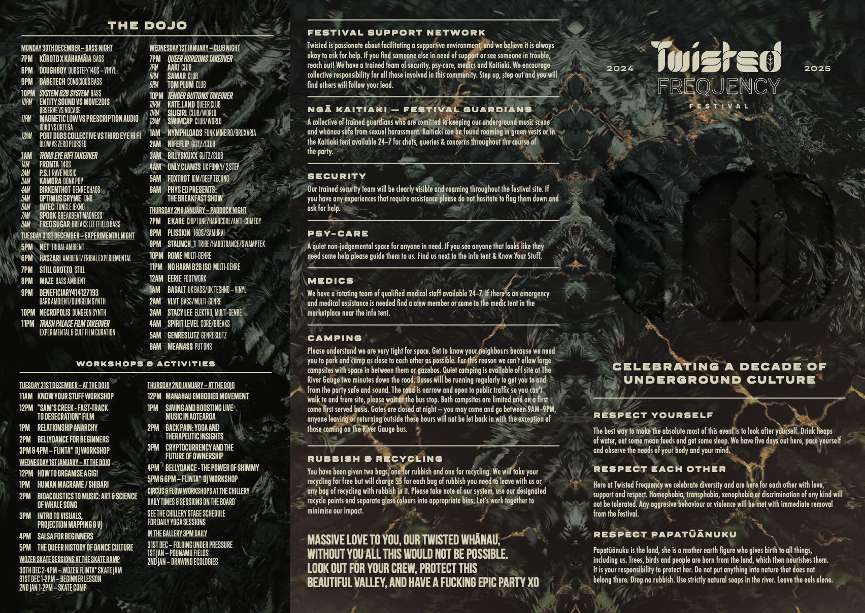 By testing the limits of sound and vision, Twisted pushes the human capacities of body, mind, and soul to reach a collective state of euphoria. Getting pummeled by rollercoastering freak-uencies and twisted aural assaults (or when lying down, a purring massage through the whenua), leads us to those untouchable heights.